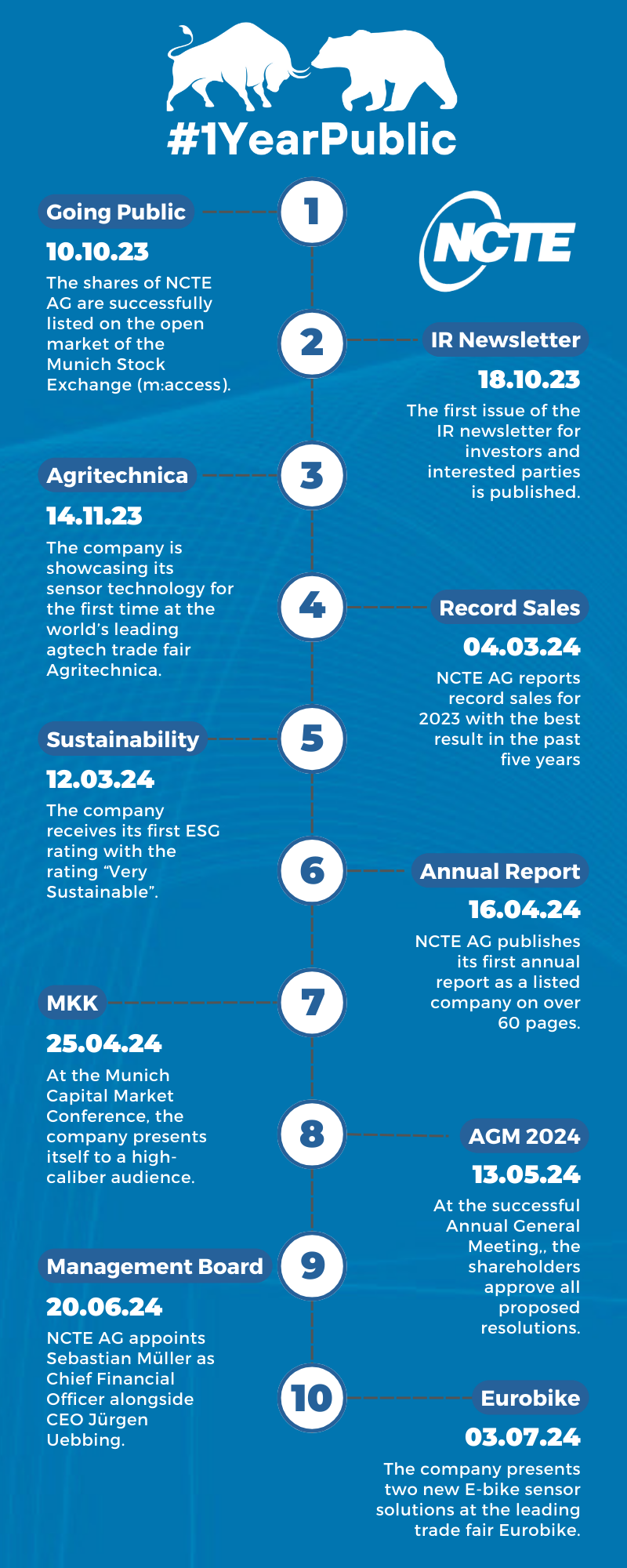 Munich/Oberhaching, 10.10.2024: NCTE AG today celebrates its first anniversary on the Munich Stock Exchange in the m:access SME segment (ISIN: DE000A0LEZB2, WKN: A0LEZB). Since its listing in October 2023, the company has not only made progress in the areas of technology and sustainability, but has also significantly expanded its investor relations activities.